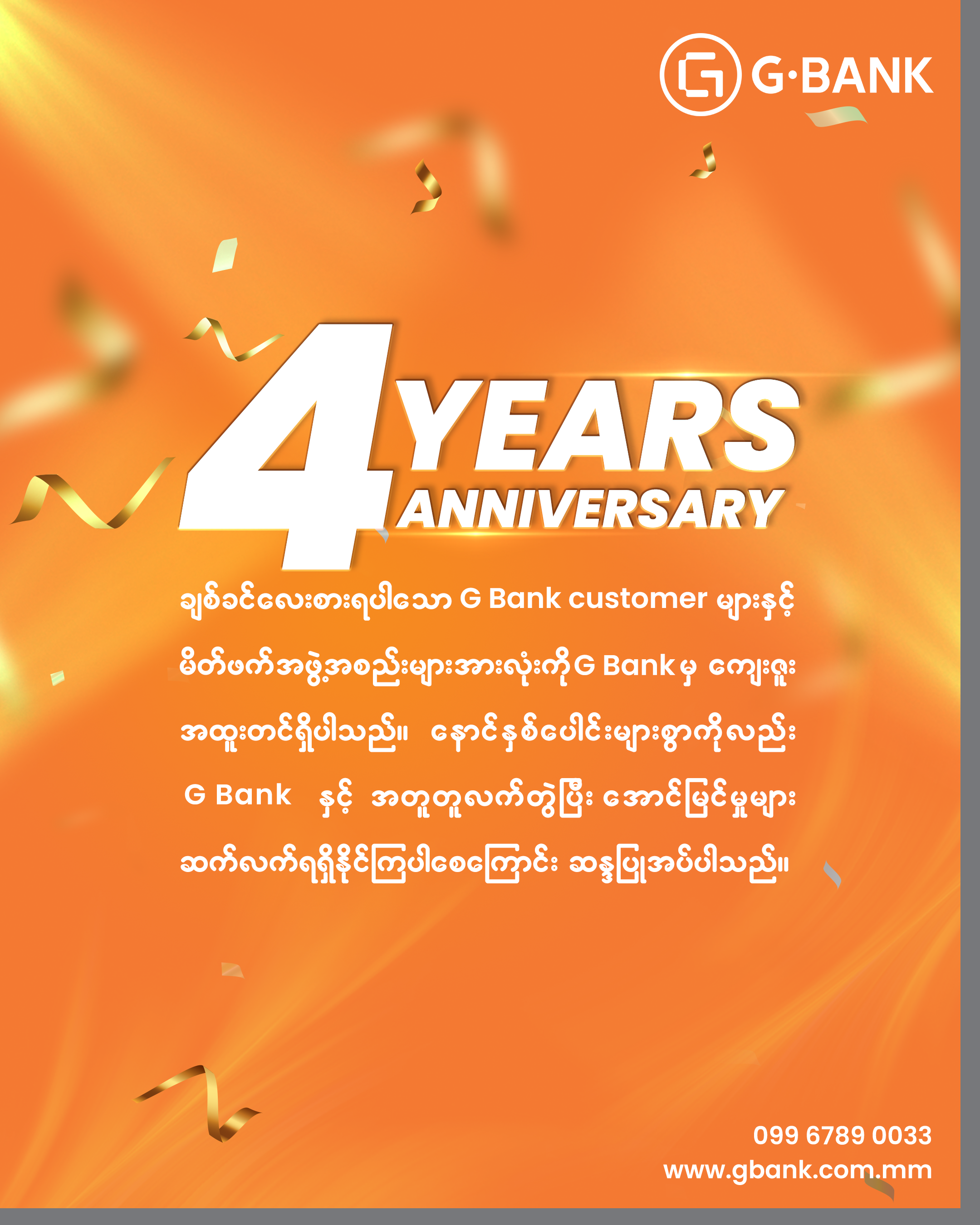 Bank ၏ ပထမဦးဆုံးဘဏ်ခွဲဖြစ်သော မုံရွာဘဏ်ခွဲ ဖွင့်လှစ်ခဲ့သည်မှစ၍ ယနေ့ (၄)နှစ်ပြည့်သည်အထိ ယုံကြည်စွာအားပေးခဲ့ကြသော မိတ်ဟောင်းမိတ်သစ် Customer များအား ကျေးဇူးအထူးတင်ရှိပါသည်။
