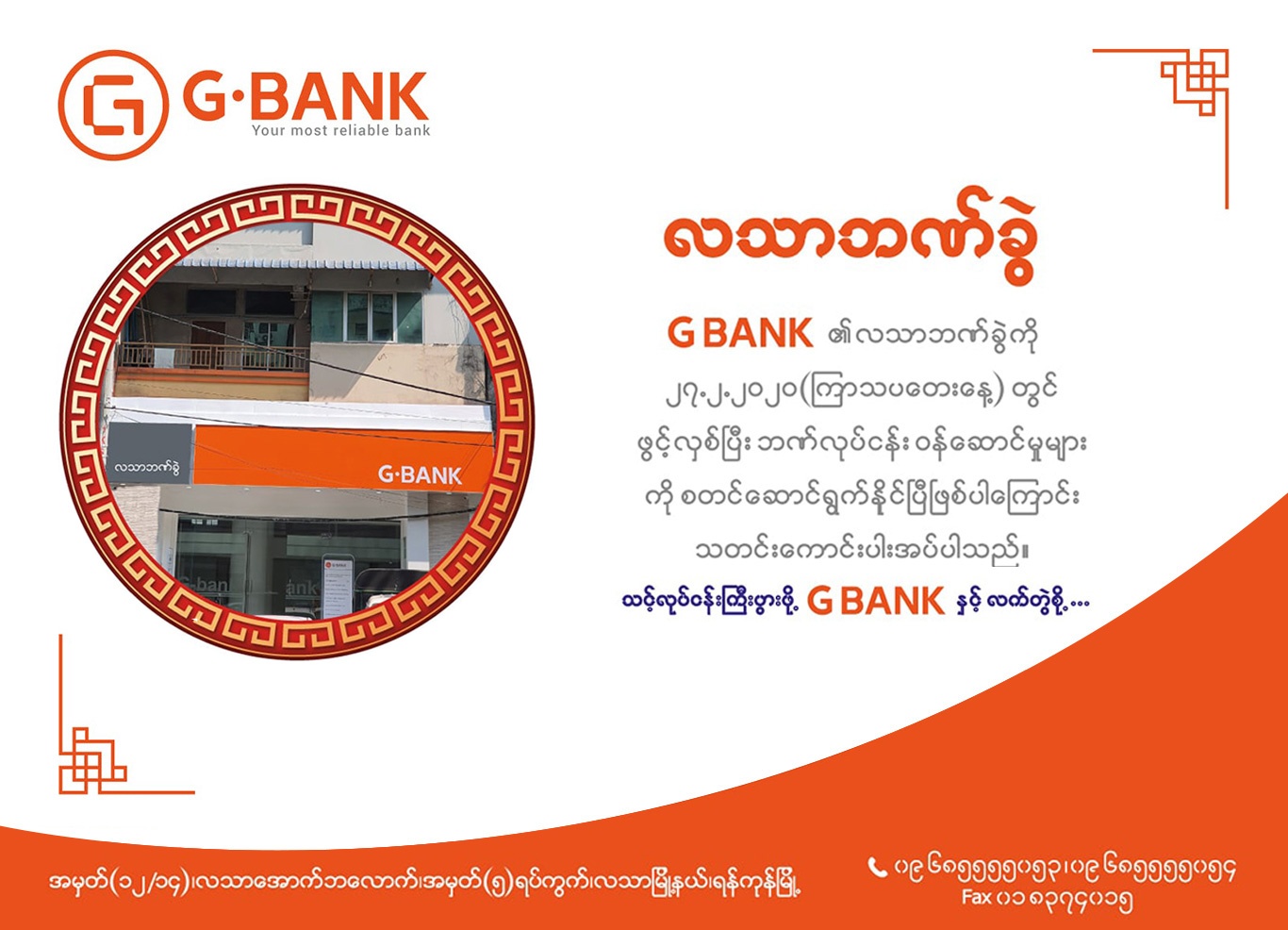 Bank ၏ အဋ္ဌမမြောက် ဘဏ်ခွဲဖြစ်သော လသာဘဏ်ခွဲကို ရန်ကုန်တိုင်းဒေသကြီး လသာမြို့နယ်၌ (၂၇.၂.၂၀၂၀) ရက် ကြာသပတေးနေ့တွင် ဖွင့်လှစ်ခဲ့ပြီး ဖြစ်ပါသဖြင့် ငွေလွှဲလုပ်ငန်းများ၊ ငွေသွင်း၊ ငွေထုတ် လုပ်ငန်းများကို စတင်ပြုလုပ်နိုင်ပြီဖြစ်ပါကြောင်းနှင့် ဘဏ်လုပ်ငန်း ဝန်ဆောင်မှုများကို ရယူနိုင်ပြီဖြစ်ကြောင်း မိတ်ဟောင်း၊ မိတ်သစ်များအား သတင်းကောင်းပါးအပ်ပါသည်။