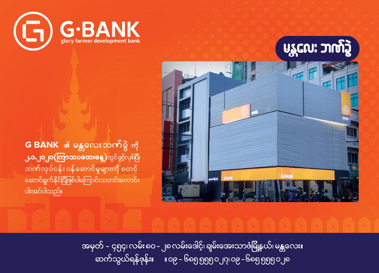 ၏ ဆဌမမြောက် ဘဏ်ခွဲကို မန္တလေးတိုင်း ဒေသကြီး ချမ်းအေးသာဇံ မြို့နယ်၌ (၂.၁.၂၀၂၀) ရက် ကြာသပတေးနေ့တွင်ဖွင့်လှစ်ပြီး ဖြစ်ပါသဖြင့် ငွေလွှဲလုပ်ငန်းများ၊ငွေသွင်း၊ ငွေထုတ် လုပ်ငန်းများကို စတင်ပြုလုပ်နိုင်ပြီဖြစ်ပါကြောင်းနှင့် ဘဏ်လုပ်ငန်းဝန်ဆောင်မှုများကို ရယူနိုင်ပြီ ဖြစ်ကြောင်း မိတ်ဟောင်း၊ မိတ်သစ်များအား သတင်း ကောင်းပါးအပ်ပါသည်။