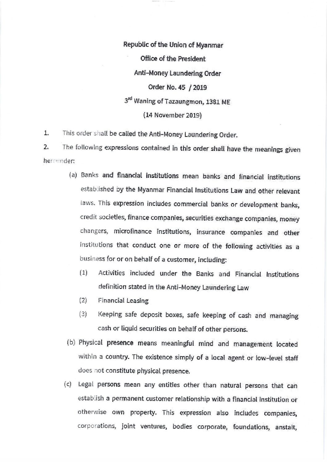 ငွေကြေးခဝါချမှု တိုက်ဖျက်ရေး ဥပဒေ ဆိုင်ရာ အမိန့် (၄၅/၂၀၁၉)